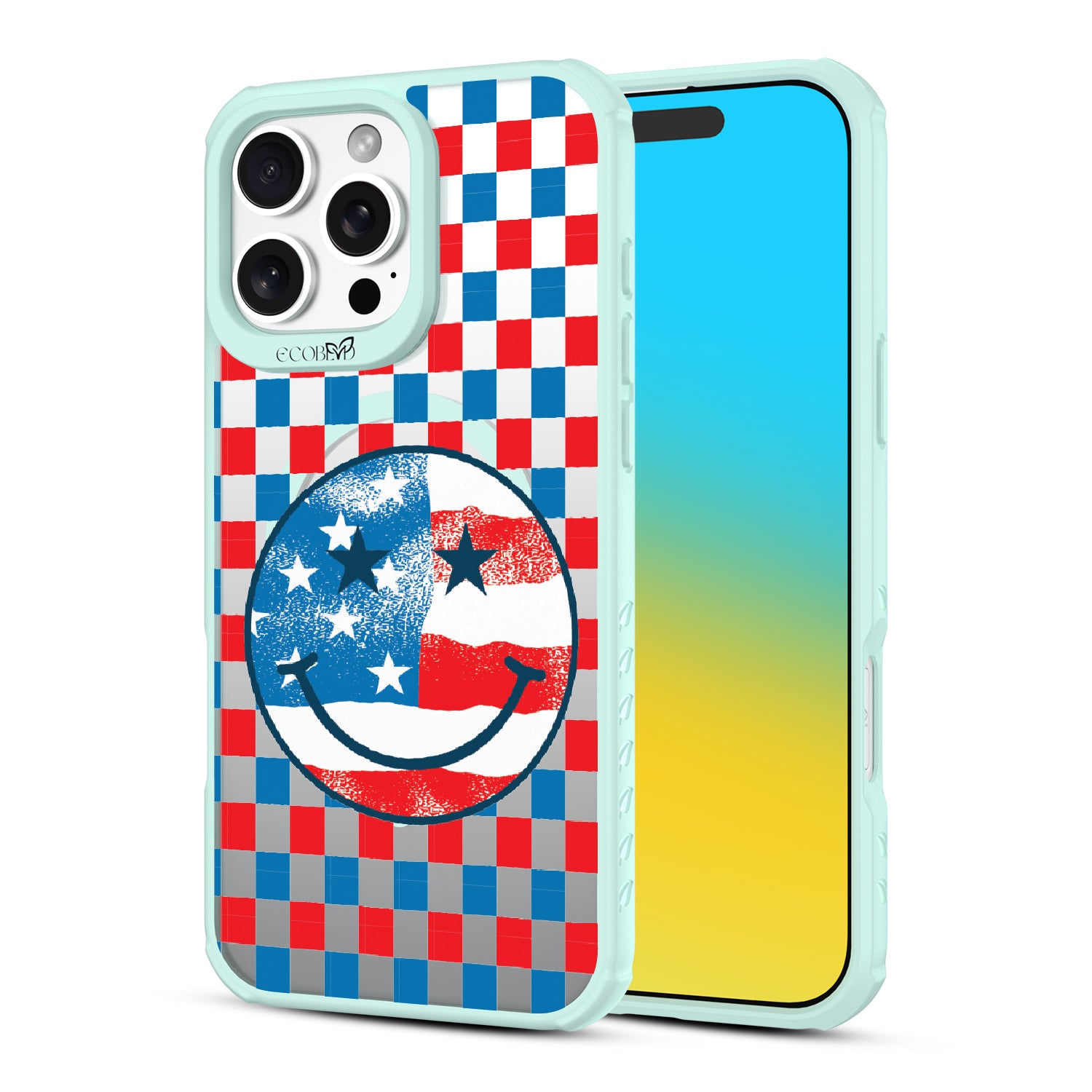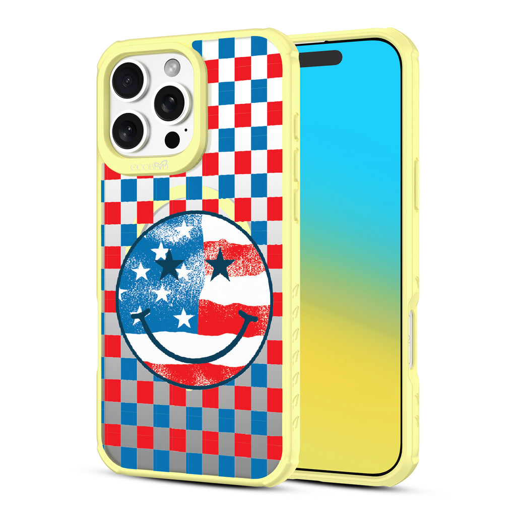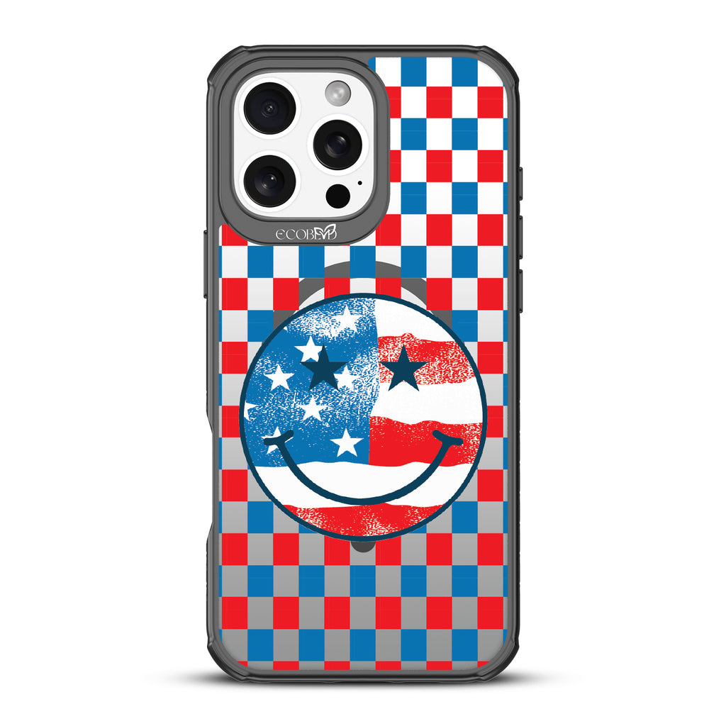 Rock your stars and stripes with The Anthem design on our Revive clear iPhone 16 Pro Max phone case. The edgy red, white, and blue checker print and iconic smiley face embody the punk spirit of freedom. Turn up the volume and let your phone sing its anthem.