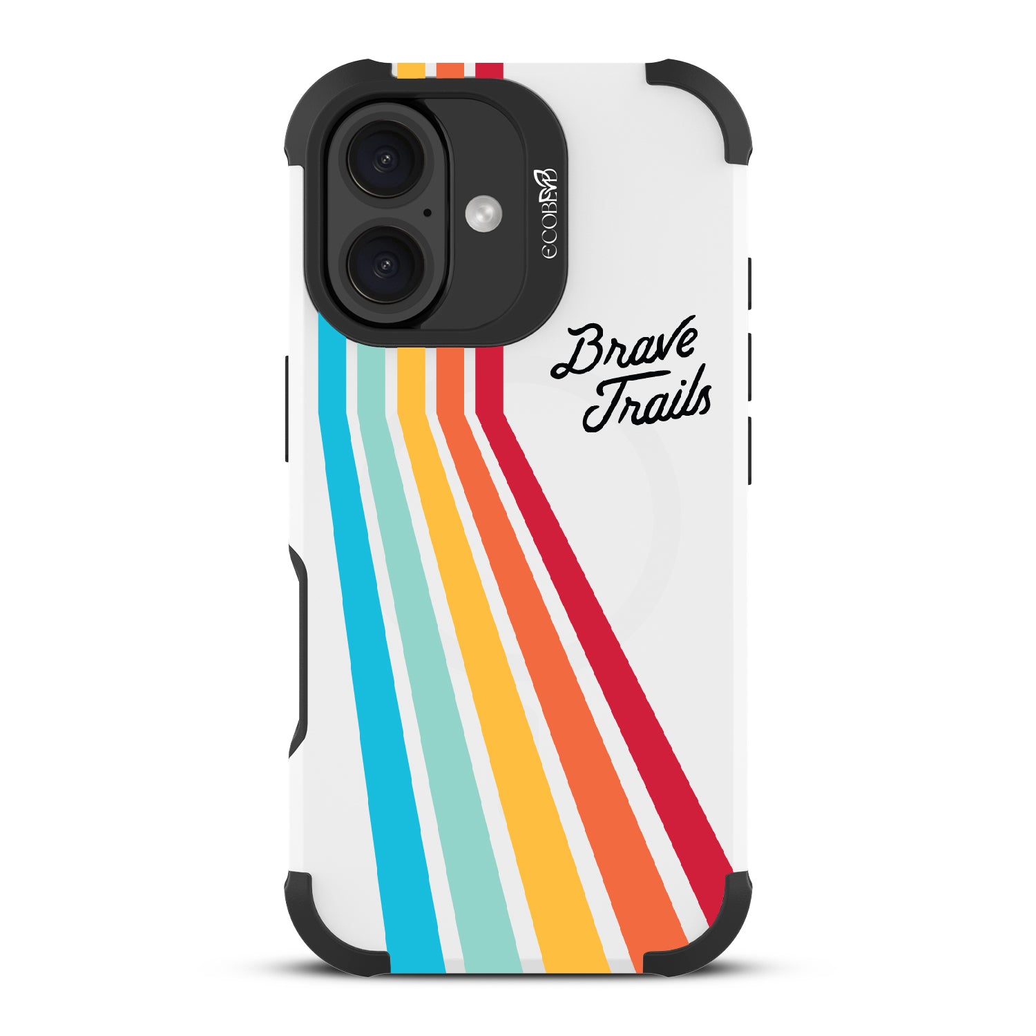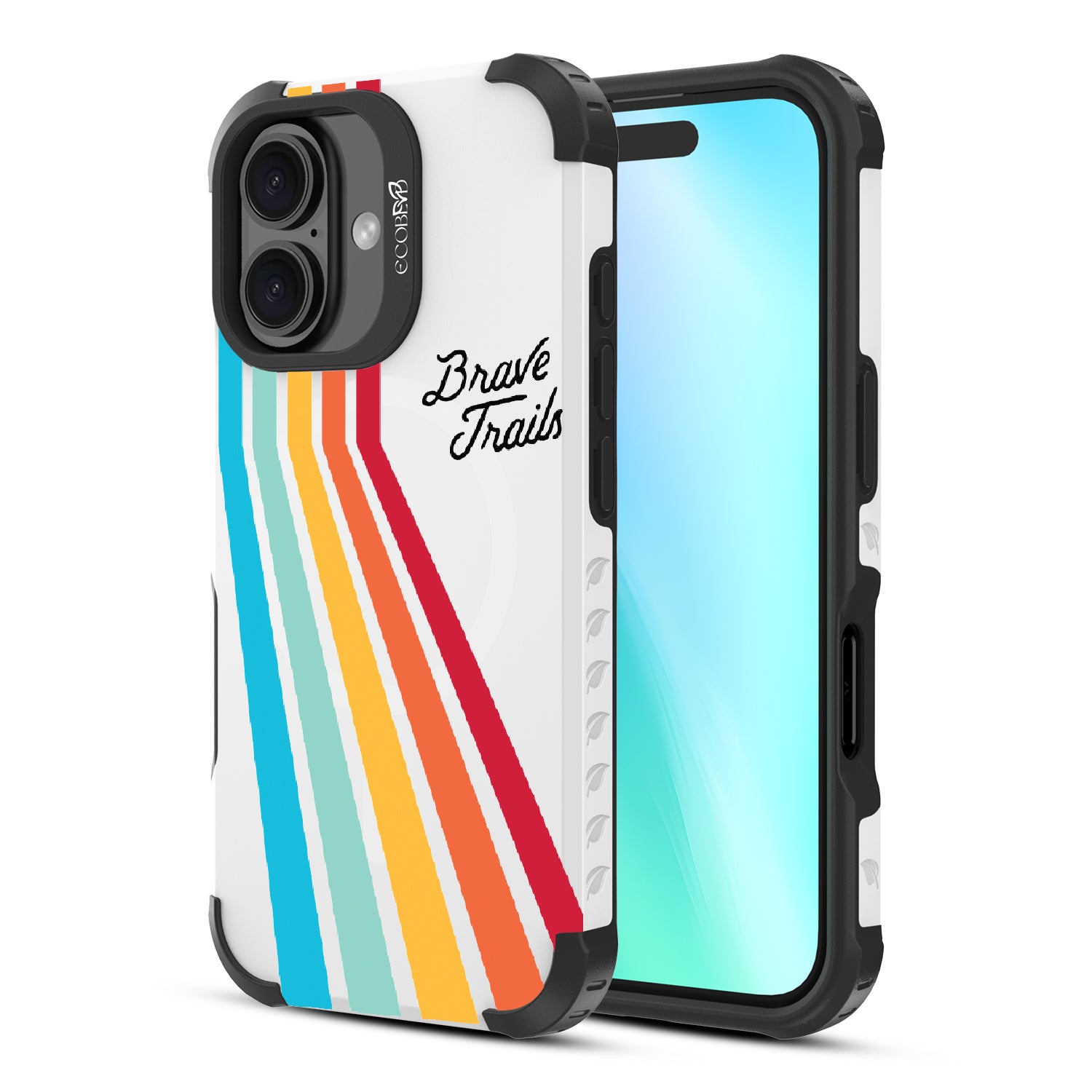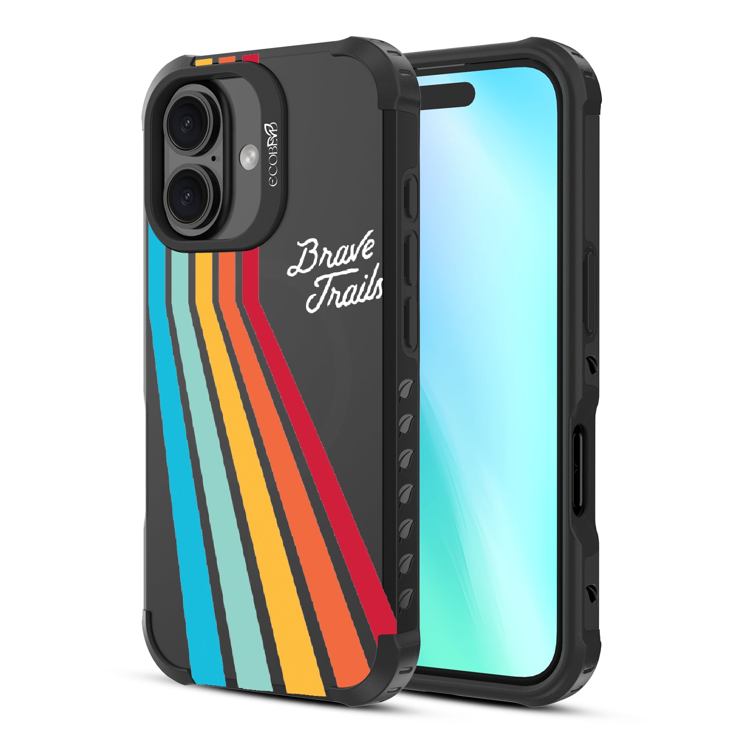 Forge your own path with the Trailblazer x Brave Trails Reforge rugged iPhone 16 phone case. Its design celebrates the spirit of adventure and fearlessness. The intertwining trails, painted in a vibrant spectrum of rainbow colors, symbolize the diverse journeys we embark upon in life. With the Brave Trails logo shining brightly at its core, this design serves as a beacon of inspiration, encouraging you to break barriers and blaze a trail that is uniquely yours.