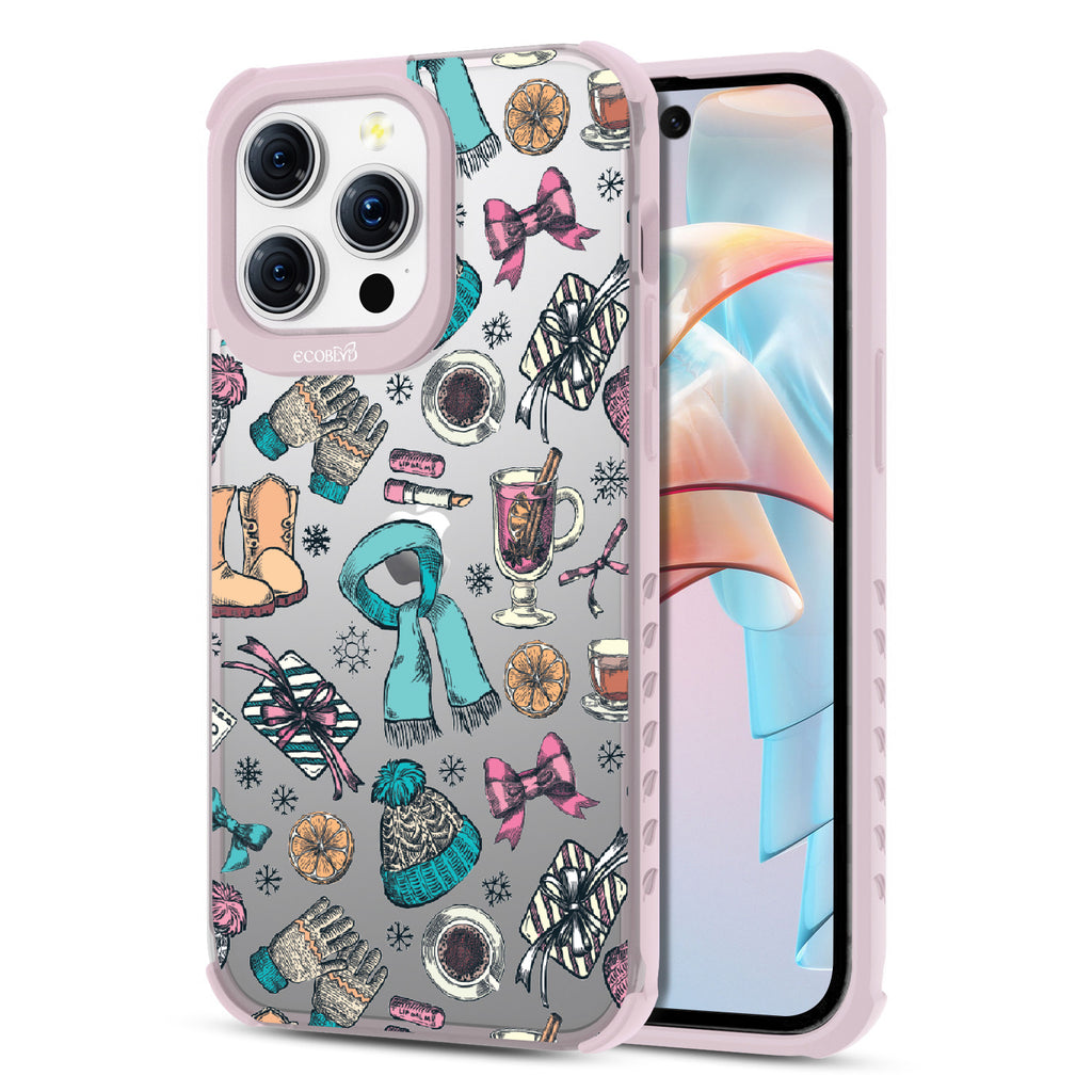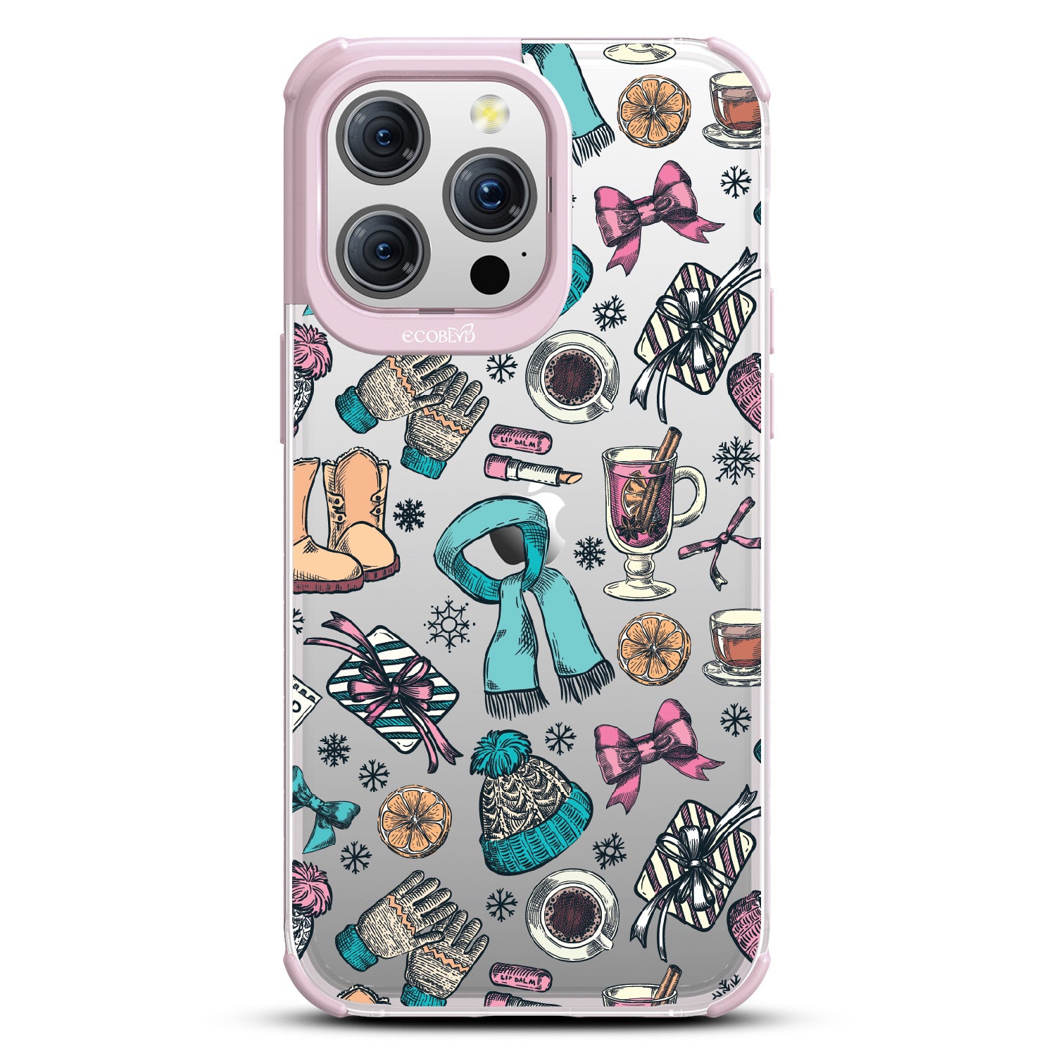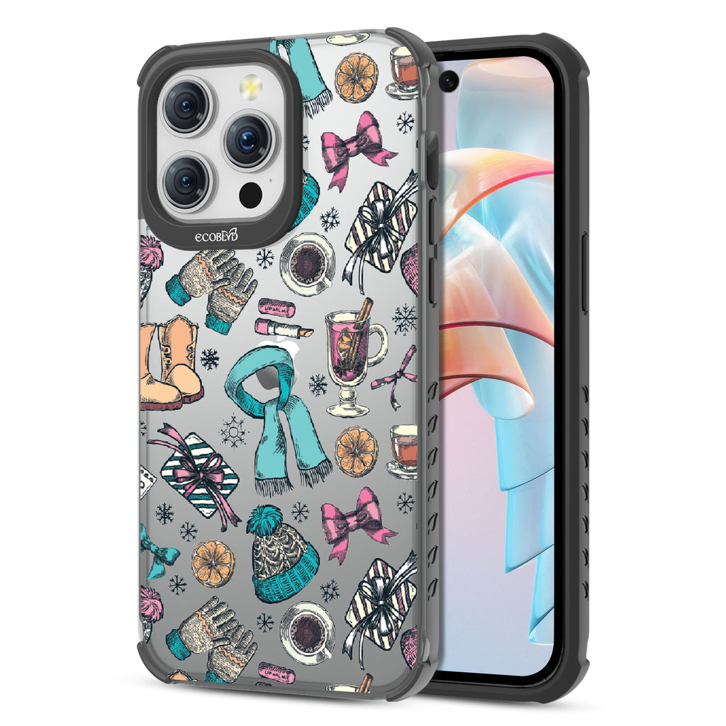 Keeping your phone warm this time of year has never been easier thanks to the Winter Essentials design on our Laguna clear iPhone 15 Pro Max case, which includes beanies, scarves, mittens, furry boots, and hot drinks always at your fingertips.