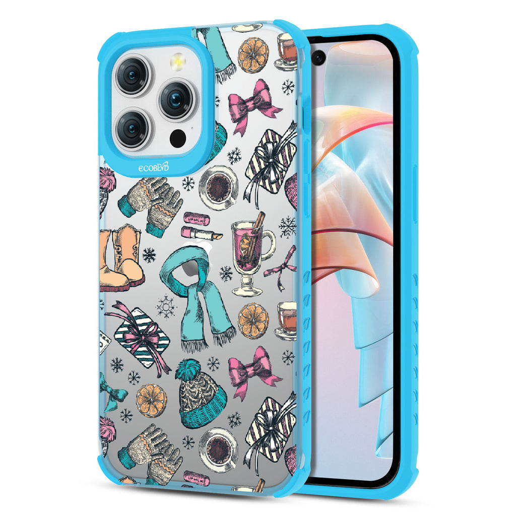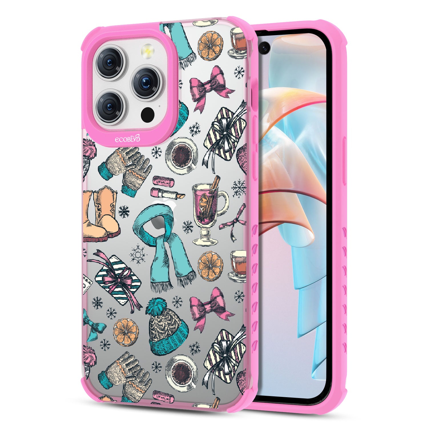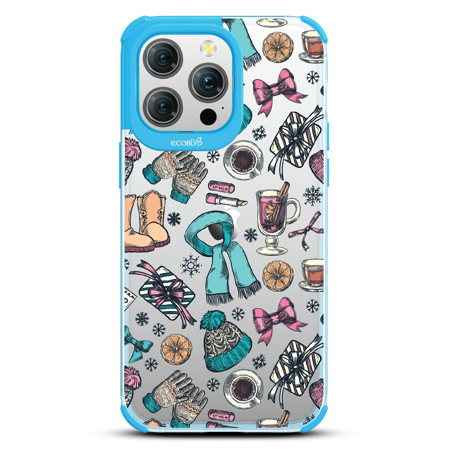 Keeping your phone warm this time of year has never been easier thanks to the Winter Essentials design on our Laguna clear iPhone 15 Pro Max case, which includes beanies, scarves, mittens, furry boots, and hot drinks always at your fingertips.