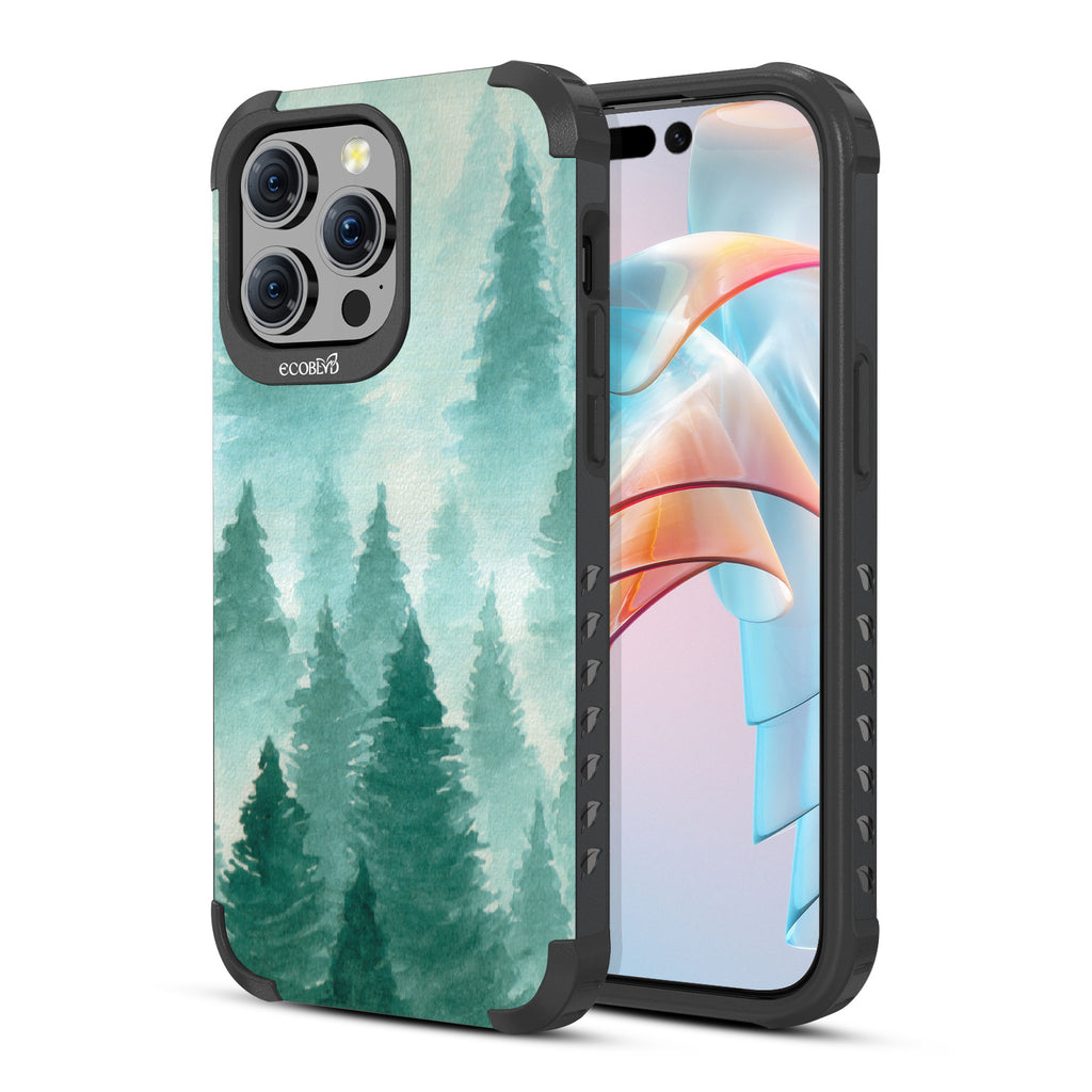 The Winter Pine phone design on our Mojave rugged and compostable iPhone 15 Pro Max case covers your phone in a serene scene of watercolored evergreens inspired by holiday treks in the woods to find the perfect tree.