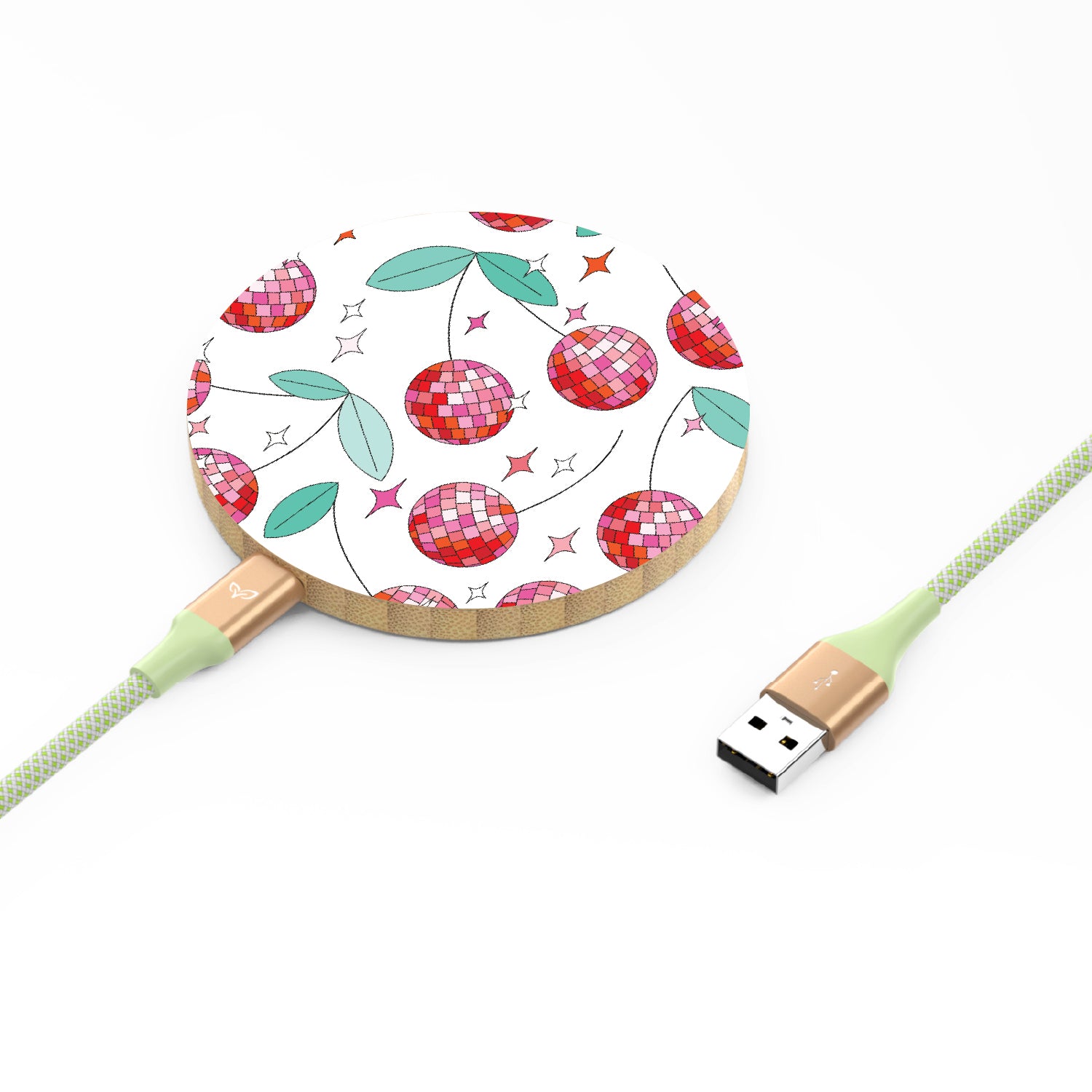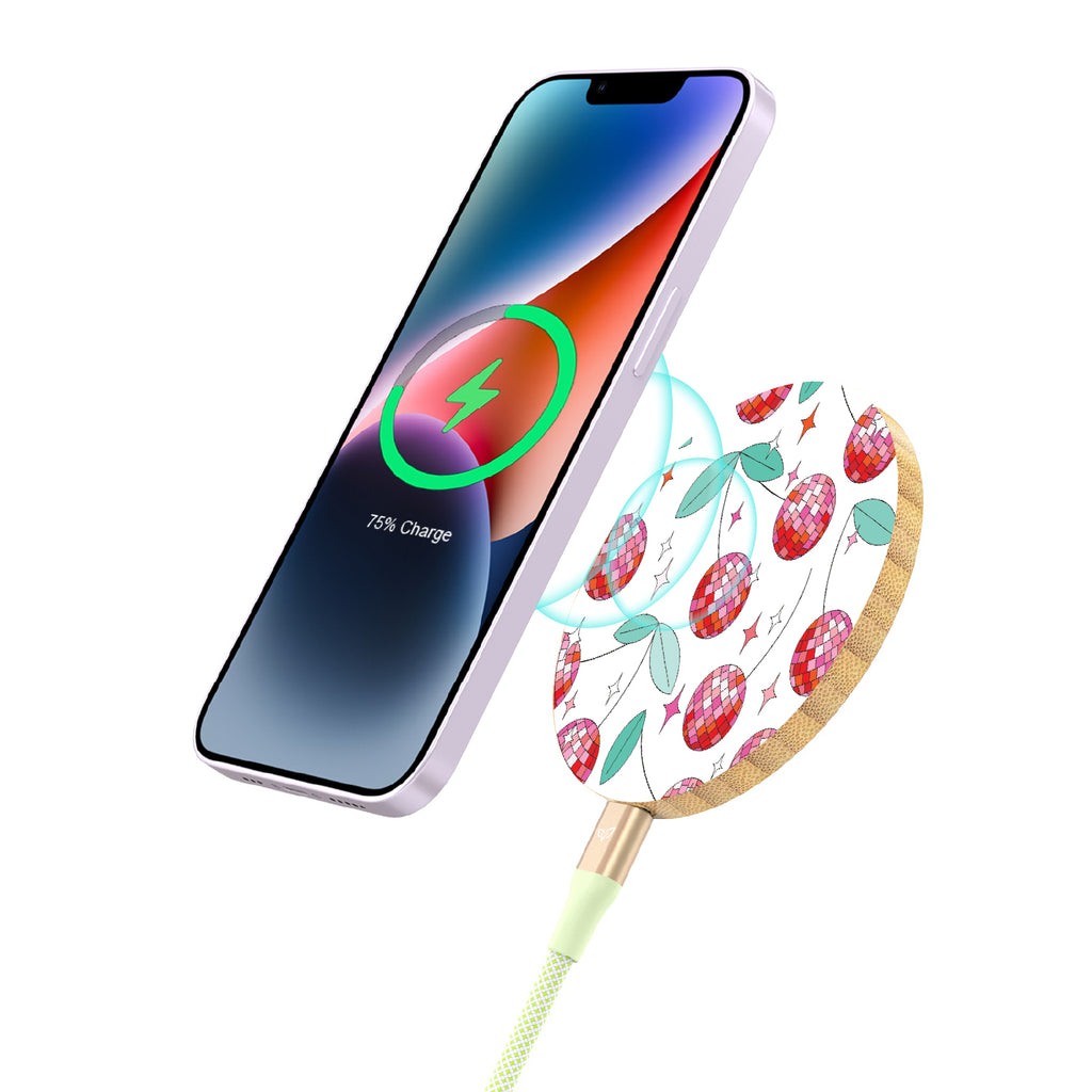 Don’t let a low battery sour your plans. With the Cherry Disco design on our Bamboo Wireless Charger, you can keep your device charged up and ready to go.